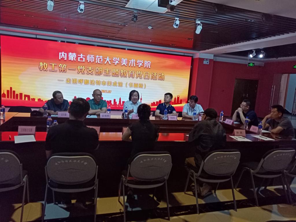 为进一步推动学习贯彻习近平新时代中国特色社会主义思想主题教育走深走实,加强调查研究,不断增强基层党支部的凝聚力、战斗力,7月15日上午,色情app 教工第一党支部举办主题党日活动——走进呼和浩特市美术馆,参观“‘丹青颂莲韵 翰墨扬清风’ 庆‘七一’书画剪纸文创作品展”,并就毕业生就业问题开展实地调研,与呼和浩特市美术馆相关负责同志座谈交流。色情app 党委书记王耀中党委副书记、副院长云双庆以普通党员身份出席活动并作指导。