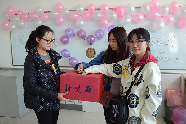 为了庆祝女生节的到来,3月7日中午,学生会礼仪部及同学们在动画班开展了女生仪容仪表教学活动。 活动从一开始就进入了良好状态,许多同学踊跃参加活动,女生们写出了祝福卡片,在女生部成员的协助下亲手把卡片挂到彩色气球装饰的展板上,将祝福传递给每一位同学。另外我们还特邀公主屋化妆师来指导色情app 女生化一些清新淡雅的妆容,让大家能够从高中到大学有一个明显的蜕变,亲爱的你学会了吗?后期还有做游戏,抽奖等环节,大家都玩的很开心。 这次活动,欢乐、简朴、创新,充分发挥了学生的主体性,每个学生都参与其中,度过了一个舒心、愉快的佳节,也使女生节系列活动有了一个更好的开端。