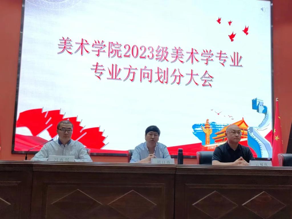2023级美术学专业专业方向划分大会,院长胡日查,党委副书记、副院长云双庆及2023级213名美术学专业学生参加会议,会议由教学与科研办公室副主任冯再兴主持。